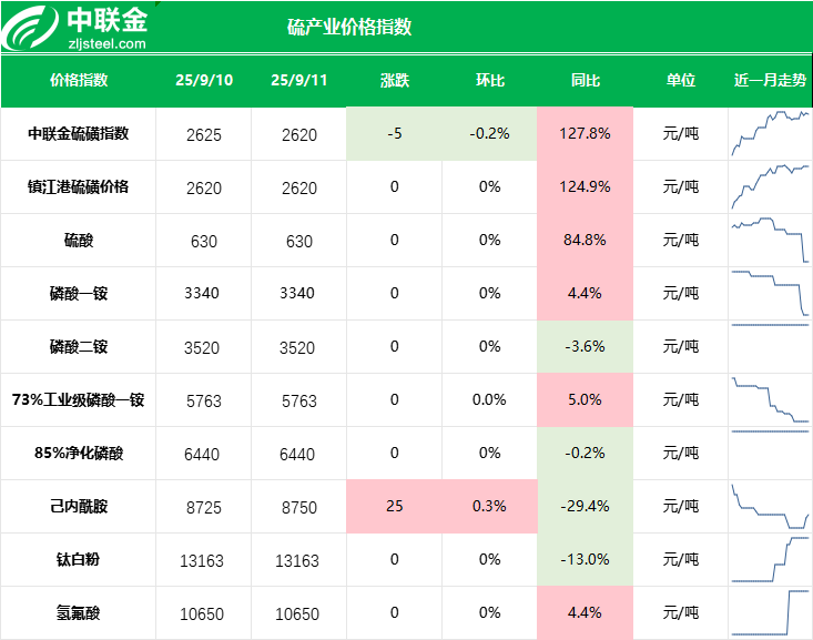 上一工作日中联金硫磺指数最新价格为2620元/吨,环比下跌5元/吨,跌幅0.2%。硫磺国内外行情分歧进一步增大,南亚,非洲需求增大,中东持货商报价上行,中东FOB价格300-310美元/吨,高端价格商谈为主,中国补货不易。但长江沿线下游需求边际减弱,尤其对10月开工情况不明朗,国内市场博弈为主。上一工作日订货量96740(+872吨)。现货方面:上一工作日主营炼厂硫磺稳价,普光万州稳价2570元/吨。大连某炼厂昨日中标价2503元/吨,环比上涨18元/吨。山东地区地炼液硫行情炼厂有提产预期,因此下游采购较为观望,主流价格2580-2600元/吨。长江沿线,采购观望,高价上行驱动力不足,小单成交价格2620元/吨。上一工作日国内港口固体硫磺现货总库存236.8万吨,较前日减少2.4万吨。