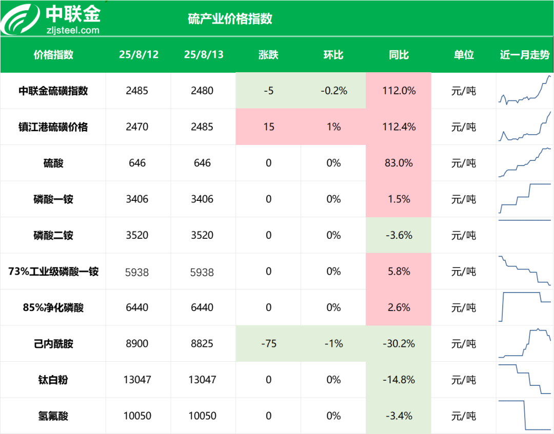 上一工作日中联金硫磺指数最新价格为2480元/吨,环比下跌5元,跌幅0.2%。昨日硫磺小幅回落,主要是因为目前涨幅而言,已经接近部分贸易商心理价位,出货或者获利盘了结意愿加强,且对下游来说,需求边际偏弱,畏高情绪导致价格滞涨。需求端平稳的预期下,价格推涨需要新的驱动力,短期上下均有空间,等待市场新的指引,上一工作日订货量102588(+586吨)。现货方面:上一工作日主营炼厂硫磺价格平稳,普光万州2440元/吨。山东地区地炼液硫货源供需偏紧局面持续,但目前价格高位,下游畏高,昨日高端价格小幅回落10元/吨,主流价格2550-2620元/吨。长江沿线,昨日现货成交量有所下滑,主要是价格高位后下游采购观望,叠加盘面上涨幅度有所减缓,现货成交价格为2480元/吨。上一工作日国内港口固体硫磺现货总库存250.2万吨,较前日减少1.5万吨。