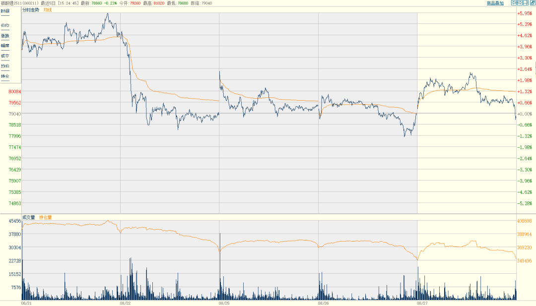 今日碳酸锂11合约高开高走,午后有所回落,临近收盘小幅跳水,全日最高价8.102万元,最低价7.868万元,收于7.886万元,日跌幅0.23%。盘口交易明细上,多平及多开占比最大。截至收盘,广州期货交易所2511合约持仓量35.1万手,增仓0.2万手;日成交73万手。主力合约日成交前二十席位多头持仓22.8万手,日增仓3320手;空头持仓29.8万手,日增仓2548手。仓单方面,广期所仓单增787手至2.75万手。商品大盘弱势运行,日跌幅1.02%。