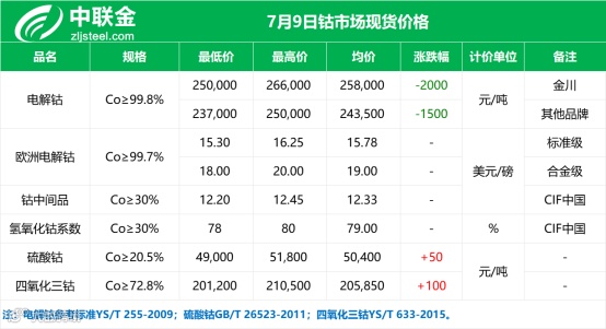 现货市场,国内电钴报价继续窄幅回调,欧洲市场电钴报价则维稳运行,当前海外原料端价格高位企稳,成本支撑力度相对较强,电钴现货市场多数主流厂商仍保持暂停对外报价策略,宏观情绪有待消化,业者避险情绪较浓。据中联金了解,今日金川钴现货报价25-26.6万元/吨,其他品牌电钴报价23.7-25万元/吨,欧洲标准级电钴报价15.3-16.25美元/磅,合金级电钴报价18-20美元/磅,钴中间品CIF中国报价12.2-12.45美元/磅,硫酸钴报价4.9-5.18万元/吨,四氧化三钴报价20.12-21.05万元/吨。