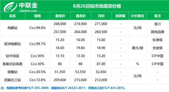 现货市场,国内电钴报价继续维稳运行,欧洲市场电钴报价由于英国银行家日无报价,当前海外原料端价格高位企稳,成本支撑力度相对较强,电钴现货市场多数主流厂商仍保持暂停对外报价策略,市场询盘氛围冷清,业者多持谨慎观望态度。据中联金了解,今日金川钴现货报价26.8-27.4万元/吨,其他品牌电钴报价25.7-26.4万元/吨,欧洲标准级电钴报价15.2-16美元/磅,合金级电钴报价18-19.8美元/磅,钴中间品CIF中国报价13.1-13.3美元/磅,硫酸钴报5.135-5.355/吨,四氧化三钴报价20.96-21.56万元/吨。