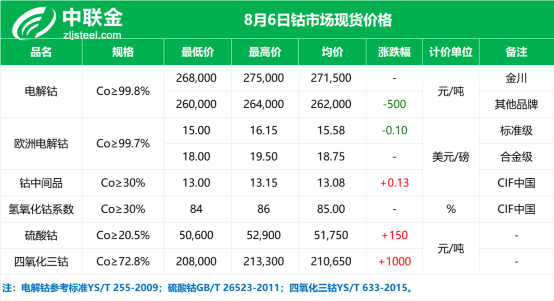 现货市场,国内电钴报价继续窄幅回落,欧洲市场电钴报价也窄幅下落,当前海外原料端价格再次上调,成本支撑力度继续走强,电钴现货市场多数主流厂商仍保持暂停对外报价策略,需求端仍以刚需采购为主,实际成交订单少有。 据中联金了解,今日金川钴现货报价26.8-27.5万元/吨,其他品牌电钴报价26-26.4万元/吨,欧洲标准级电钴报价15-16.15美元/磅,合金级电钴报价18-19.5美元/磅,钴中间品CIF中国报价13-13.15美元/磅,硫酸钴报价5.06-5.29万元/吨,四氧化三钴报价20.8-21.33万元/吨。