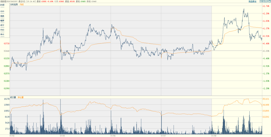 今日碳酸锂09合约高开,盘中两度大幅拉升,尾盘有所回落,全日最高价6.518万元,最低价6.34万元,终收于6.388万元,日涨幅0.69%。盘口交易明细上,多开占比最大,多平次之。截至收盘,广州期货交易所2509合约持仓量33.8万手,增仓1.6万手;日成交54.5万手。仓单方面,广期所仓单量减0.29万手至1.26万手,持续快速注销中。主力合约日成交前二十席位多头持仓19.62万手,日增仓0.56万手;空头持仓达26.76万手,日增仓1.87万手。商品大盘走势偏强,涨幅0.38%。