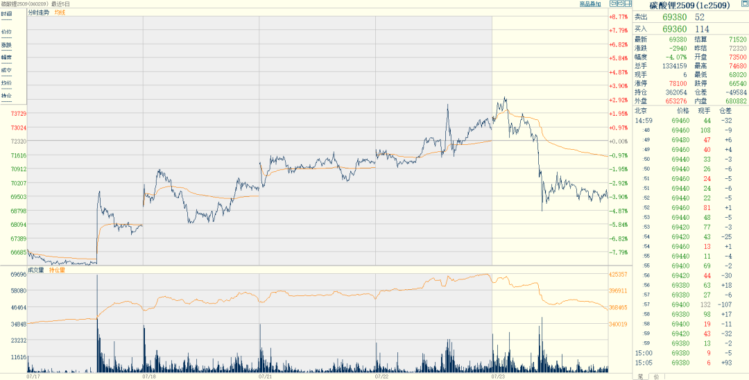 今日碳酸锂09合约高开低走,临近午间快速跳水跌破7万元关口,后维持低位震荡,全日最高价7.468万元,最低6.802万元,终收于6.938万元,日跌幅4.07%。盘口交易明细上,多平占比最大,空平次之。截至收盘,广州期货交易所2509合约持仓量36.2万手,减仓4.96万手;日成交133.42万手。仓单方面,广期所仓单量增718手至1万手。主力合约日成交前二十席位多头持仓20.8万手,日减仓2.7万手;空头持仓达30.5万手,日减仓3.5万手。