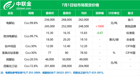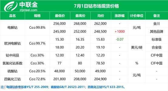 现货市场,国内电钴报价继续窄幅上涨,欧洲市场电钴报价则窄幅下探,当前海外原料端价格维稳运行,成本支撑力度相对较强,电钴现货市场多数主流厂商仍保持暂停对外报价策略,受消息面影响业者挺价情绪有所增强。据中联金了解,今日金川钴现货报价25.6-26.8万元/吨,其他品牌电钴报价24.5-25.2万元/吨,欧洲标准级电钴报价15.3-16.35美元/磅,合金级电钴报价18-20.2美元/磅,钴中间品CIF中国报价12-12.4美元/磅,硫酸钴报价4.8-5万元/吨,四氧化三钴报价20.18-20.8万元/吨。