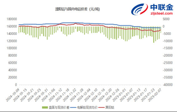 本周溧阳钴价指数小幅反弹后呈横盘震荡整理态势,成交量与订货量较上周均有明显增长趋势;本周最低报价为15.3万元/吨,最高报价为15.6万元/吨。溧阳中联金2502本周均价在14.88万元/吨,较上周均价上涨500元/吨,涨幅约为0.36%。本周现货市场电钴价格继续小幅下行,与溧阳电钴价格整体变化趋势略有不同,价差较上周有所缩小为-7300元/吨。主要原因春节假期期间刚果金局势动荡,业者担忧预期偏强,因此溧阳电钴受情绪扰动出现了小幅反弹。