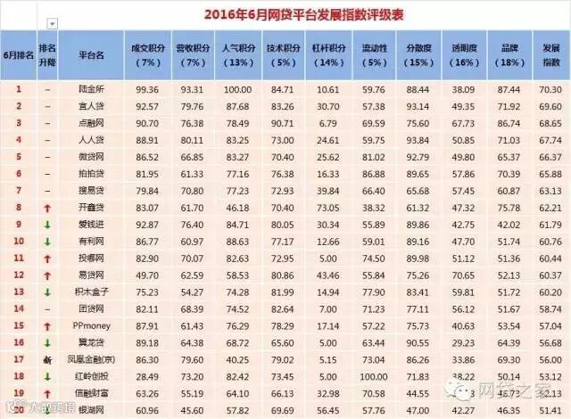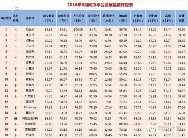 近日,网贷之家联合盈灿咨询对外发布了《2016年6月网贷平台发展指数评级》。评级报告显示,陆金所、宜人贷、点融网、人人贷、微贷网、拍拍贷、搜易贷、开鑫贷、爱钱进、有利网,发展指数排名前十。