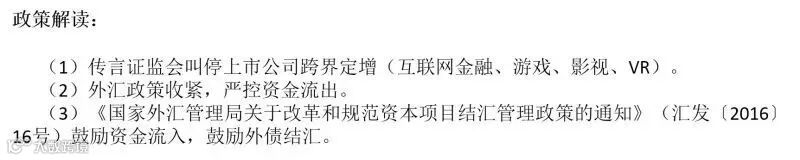 第一,市场传言证监会叫停了上市公司跨界定增重组,涉及到互联网金融、游戏、影视、虚拟现实(VR)四个行业。当然证监会出来辟谣了。但实务中,一些涉及跨界定增的项目被打回去了。所以,上市公司境外收购特别是跨界收购面临的压力巨大。