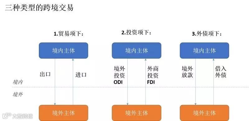 中国企业跨境交易有三种类型,第一种是进口、出口,即中国企业与境外企业做买卖。第二种叫跨境投资,包括境外投资(我们简称ODI)以及外商来华投资(我们叫FDI)。第三种是纯粹的债权交易,比如说境内企业向境外放款,或者境内向境外借款。当然我今天晚上主要给大家讲境外投资这块。