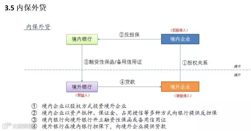第五个通道是内保外贷。内保外贷,就是境内企业给银行提供担保,由境内银行给境外银行开出融资性保函或者备用信用证,由境外银行向境外企业提供贷款。