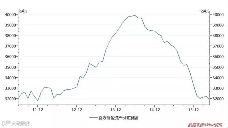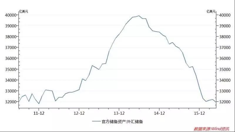 下面我用一点的时间给大家讲一下国家的宏观经济形势。可以看到,国家外汇储备由14年中的四万亿美元左右持续下降到今年4月份三万两千亿美元。外汇储备在不到两年的时间里,由四万亿下降到三万两千亿,八千亿美元就跑掉了。这其中当然有资产价值重估的原因,同时也有资本外流的原因。