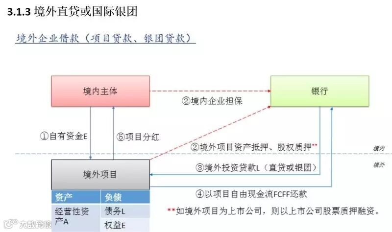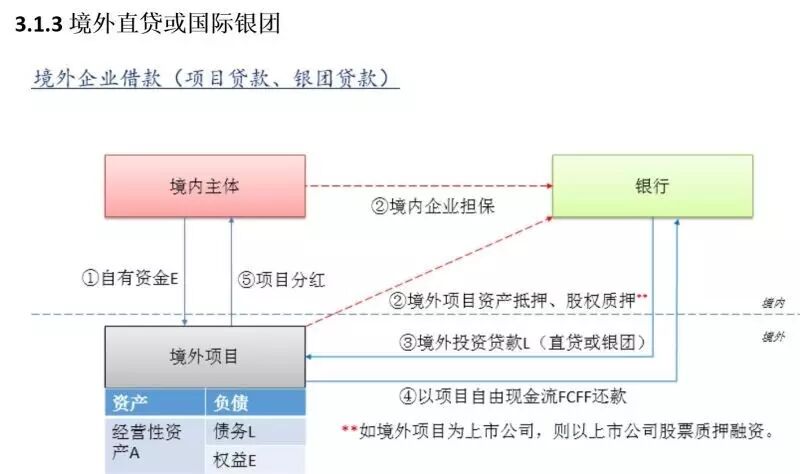 满足境内企业境外投资资金来源的第三种方式就是国际银行贷款。一般是境内银行与境外银行联合组团,给境外企业提供贷款。担保措施就可能包括境内、境外的资产抵押。这种模式适合大型项目,因为需要好几家银行共同提供资金,涉及到几家银行授信审批,流程复杂。当然,国际银团不需要外汇登记。但是银行跨境融资额度有限,国际银团融资操作难度也是非常大的。