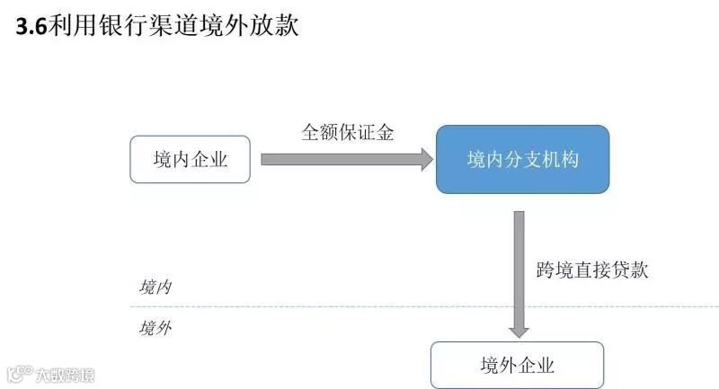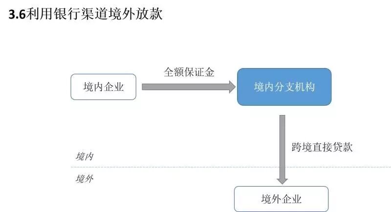 第六个通道是利用银行渠道实现境外放款。境内企业向境内银行提供全额保证金质押,由境内银行直接向境外企业发放贷款。银行认为这种“当铺业务”属于低风险。但这个业务处于灰色地带,金融监管部门没有出台过操作细则,一些银行能做,一些银行则不能做。