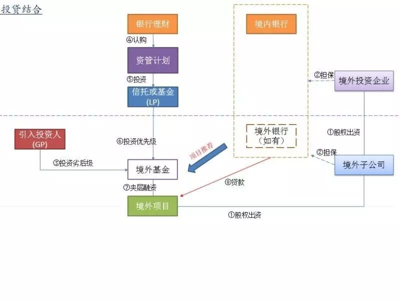 站在商业银行角度,跨境人民币投贷基金是投贷结合的好载体。一般来说,国际银团贷款不会涉及外汇问题,所以债权出资可以通过国际银团贷款解决。但是,投资款出境就需要走一些特别通道了。银行借道跨境人民币投贷基金可以在国际投资、并购中实施投贷结合。如图所示,银行理财认购了资管计划,资管计划认购了跨境人民币有限合伙基金,实现出境,并以LP身份投资于境外的并购基金,从而实现投贷联动。