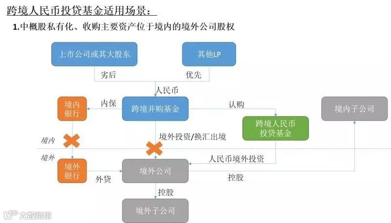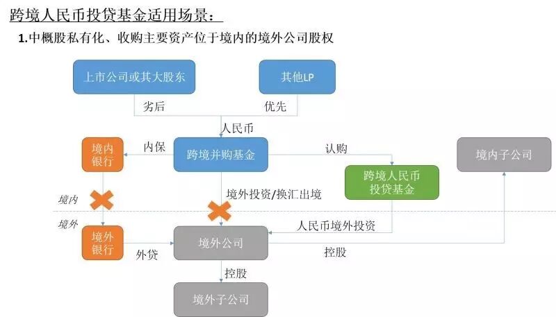 跨境人民币投贷基金是个新事物,也是小众产品,那么它有哪些用途呢?我再给大家介绍一种场景。对计划操作境外投资的企业而言,它是能够解决资金出境通道问题的。例如,上市公司或者其大股东作为劣后投资者,与其他优先级LP组建了一个跨境并购基金实施并购,境外标的公司的资产部分位于境外,部分位于境内。这种情况下,内保外贷不适用。境外投资项下外汇出境不好使,咋办?如果企业承担了额外1%的通道管理费,借道跨境人民币投贷基金,是可以实现资金出境的。因此,跨境人民币投贷基金适合投资中概股退市,甚至适合投资境外的私募基金、各类股权和债权资产。在国际并购中,即使国际银团也只能解决债权部分的融资,而股权资金就需要借助跨境人民币投贷基金出境了。
