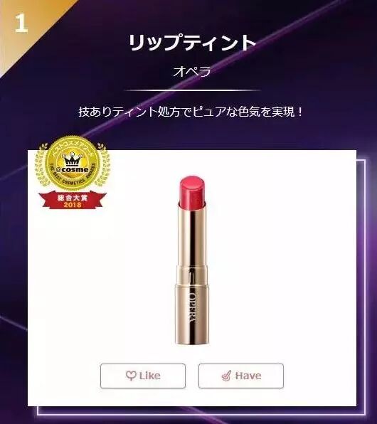 娥佩兰的这款滋润唇膏已经连续两年排行第一名了,而且不仅是综合大赏第一,又是染唇液类别第一,还是Cosme Store人气第一名!