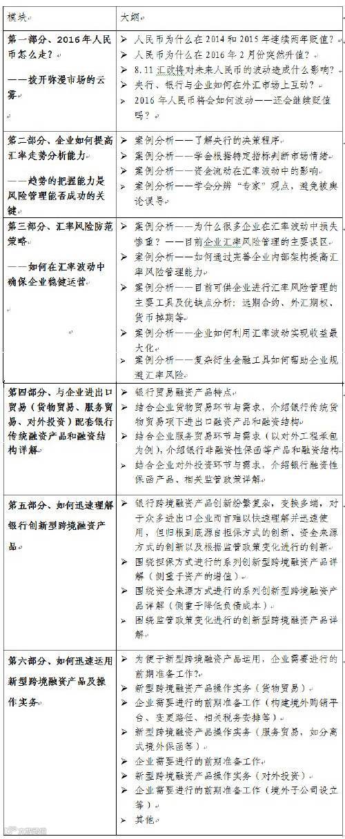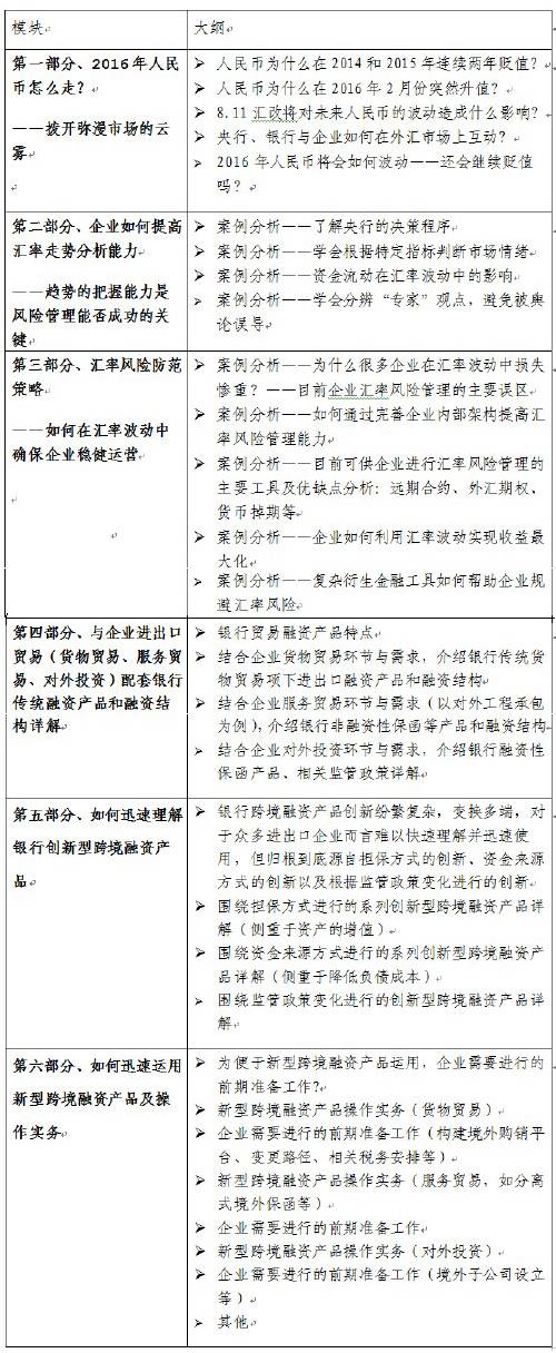 然而,当今国际外汇市场上,汇率波动具有经常性和不确定性,这给企业及金融机构的经营和发展带来很大的影响。对于企业,特别是对于从事跨国经营业务和进出口业务的企业在日常经济运行中难免会遇到因汇率变动而产生的汇率风险。2016年人民币怎么走?央行、银行与企业如何在外汇市场上互动?企业如何提高汇率走势分析能力?为什么很多企业在汇率波动中损失惨重?企业如何利用汇率波动实现收益最大化?复杂衍生金融工具如何帮助企业规避汇率风险?如何迅速理解银行创新型跨境融资产品?为便于新型跨境融资产品运用,企业需要进行的前期准备工作?等等。所有这些都是值得银行和企业加以密切关注并协同解决的关键问题。