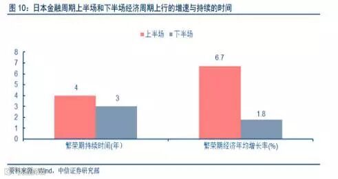 因此,即使金融周期下半场的经济周期处于上行阶段,其动力和持续性一般都会比上半场中的要弱。比如,日本在金融周期见顶之前经历的一个繁荣时段,年均经济增速为6.7%,持续时间达4年(1987-1990),金融周期见顶后经历的一个复苏时期年均经济增速只有 1.8%, 持续时间也缩短至3年(1995-97)。