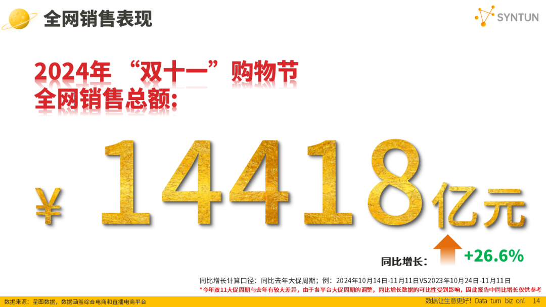 根据星图数据,今年“双十一”期间,全网销售总额达14418亿元,同比增长了26.6%。其中,综合电商平台(其中天猫不含点淘)总计销售额为11093亿元,同比增长20.1%;天猫占据销售额榜首。直播电商销售额为3325亿元,同比上涨54.6%,抖音领衔。