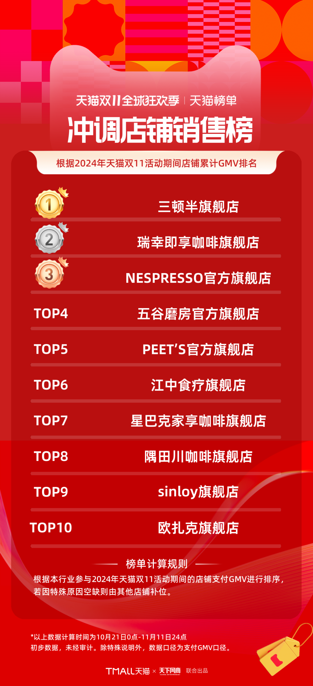 3. 品牌商家爆发:预售 4 小时,天猫成为食品生鲜品牌生意爆发的核心阵地。众多知名品牌取得优异成绩,在第一阶段食品生鲜店铺销售榜中,星巴克、airmeter 空刻、三顿半成为 “三强”。