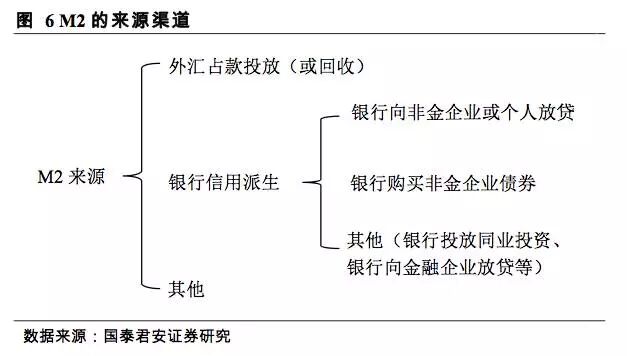 而信用货币(以广义货币M2表示)的来源渠道有限,包括外汇占款投放、银行信用派生、其他投放等。银行信用派生,又主要包括银行放贷、银行购买企业债、银行投放同业投资等。其他投放则包括央行直接投放M2等,总量较小,非常规行为,比如2015年央行向证金公司发放再贷款。