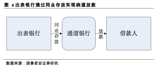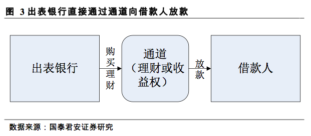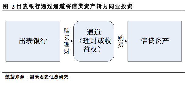 以某同业机构或产品(即通道)的名义,向出表银行收购信贷资产,同时由出表银行自有资金购买该同业产品或收益权,或向该同业机构放款。此间,出表银行以暗保、抽屉协议等方式,承担了通道银行放款业务的风险与收益。通过这种方法,原来出表银行自己的信贷,变成了购买通道银行的理财产品或收益权,在表上体现为同业投资,从而规避了存贷比、合意信贷规模、资本消耗等监管。