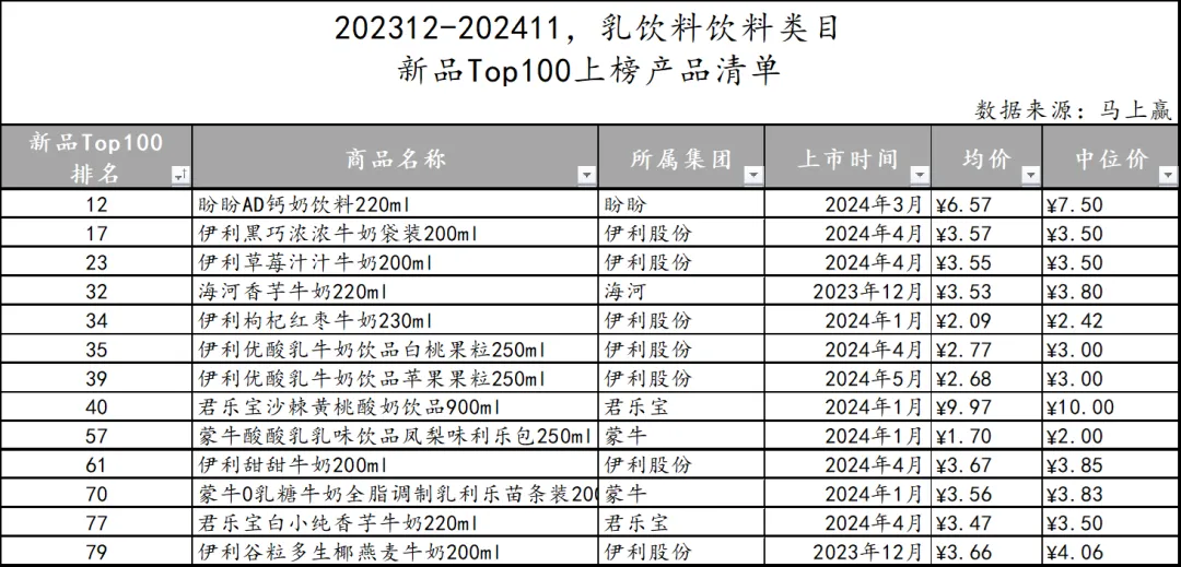 在对TOP 100 SKU的新品类目归属梳理之后,可以看到,植物蛋白饮料、能量饮料、营养素饮料、即饮奶茶四个类目下并无新品进入TOP 100 SKU行列。