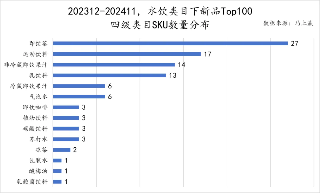 从新品TOP 100 SKU的类目分布来看,即饮茶(有糖即饮茶+无糖即饮茶)延续了2023年的火热之势,期间共有27款新品入列,侧面体现其新品数量之多、质量之高令其余类目望尘莫及。紧随其后的是运动饮料、非冷藏即饮果汁和乳饮料三个类目,入列SKU数量分别为17、14、13款。
