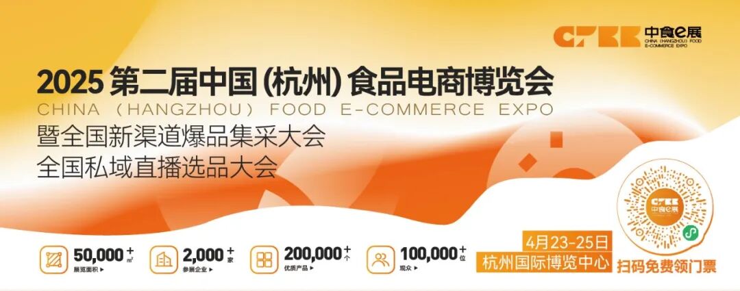 4月23日-25日,中国(杭州)食品电商博览会暨全国新渠道爆品集采大会、全国私域直播选品大会,即将于杭州国际博览中心盛大举办!展览面积达到5万+平方米,2000+优质食品展商!200,000+ 产品同台展示, 超10万+食品专业大买家汇聚一堂!一站式满足您的逛展、对接、选品、社交需求!