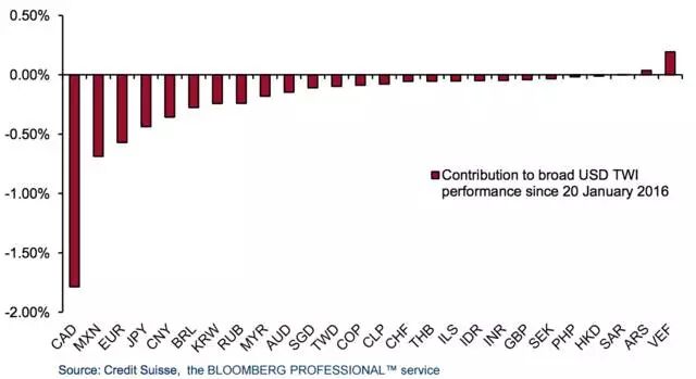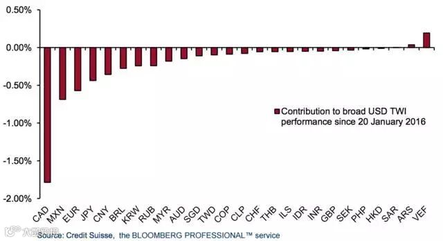 下图来自瑞信团队,显示了各大货币自一月中旬以来对美元贸易加权指数的“贡献”: