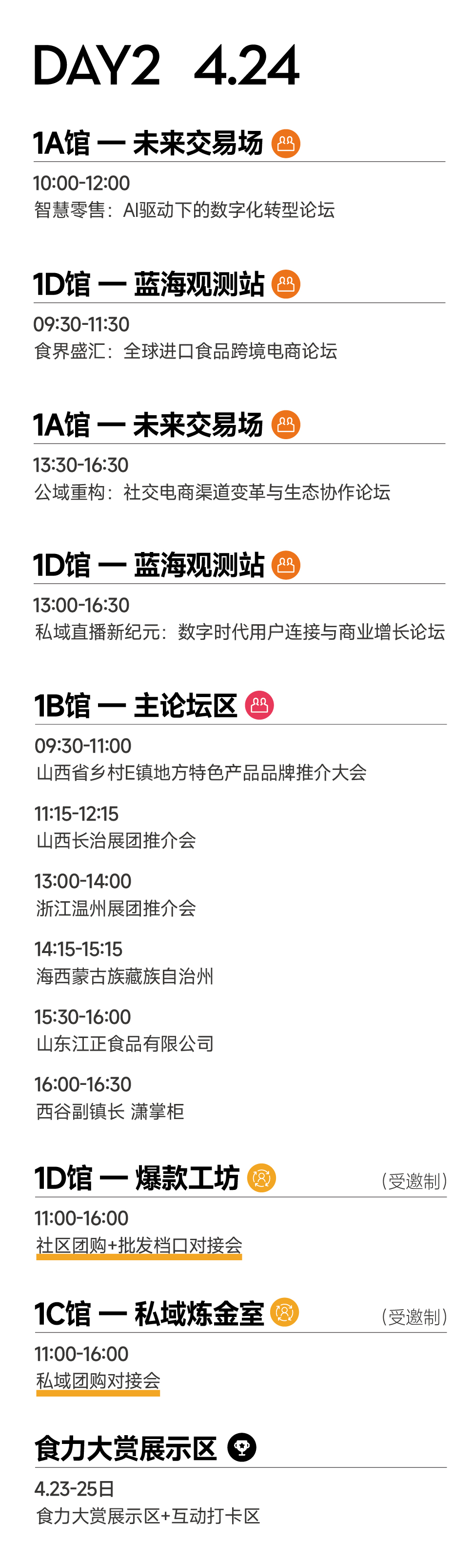 展期同期举办四大火爆主流渠道精准对接会,包括私域直播对接会、MCN公域达人对接会、私域团购对接会、社区团购+批发档口对接会。与您共享市场趋势,助您精准选品采购,发现潜在商机,共同推动食品行业繁荣发展。