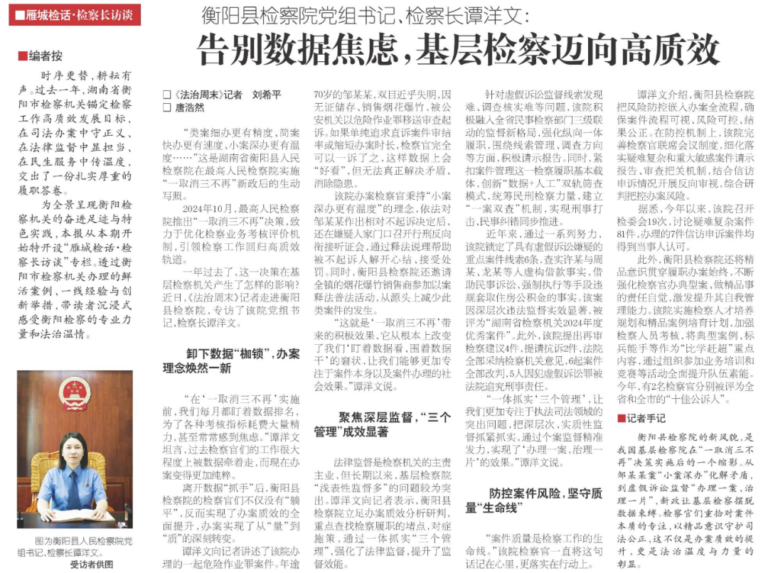 为全景呈现衡阳检察机关的奋进足迹与特色实践,本报从本期开始特开设“雁城检话·检察长访谈”专栏。透过衡阳市检察机关办理的鲜活案例、一线经验与创新举措,带读者沉浸式感受衡阳检察的专业力量和法治温情。