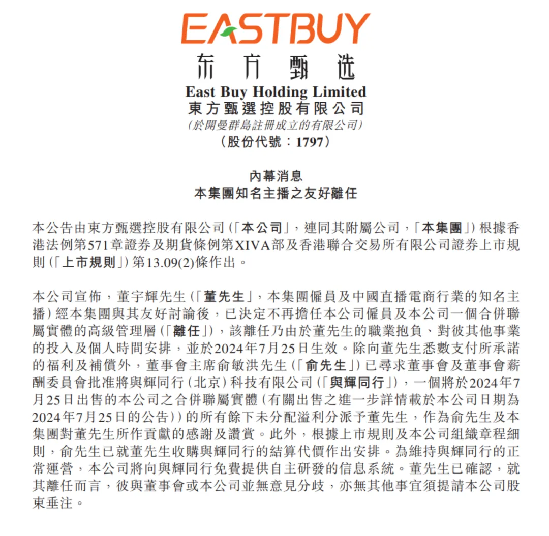 2024年7月25日,东方甄选正式对外宣布,其知名高管董宇辉已决定辞去公司及其合并联属实体的高级管理职务,此变动自即日起生效。董宇辉的离职决定,系出于对个人职业规划的深入考量。