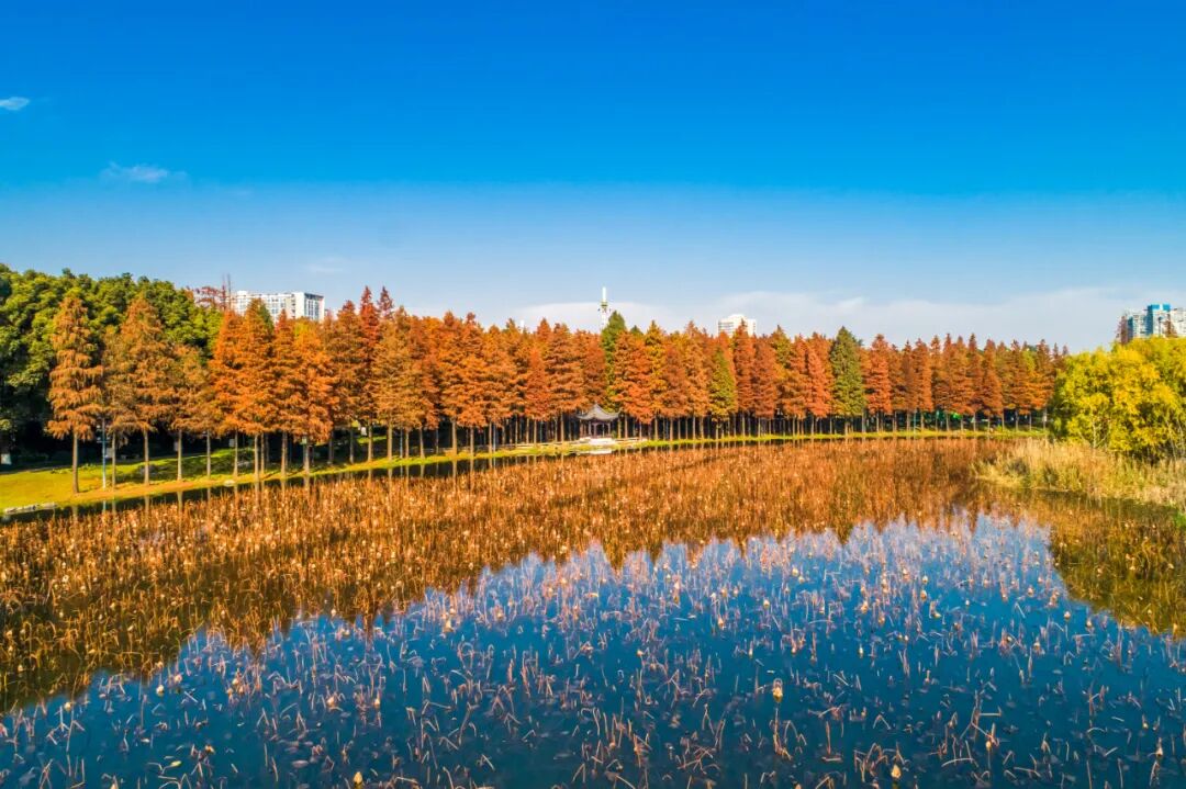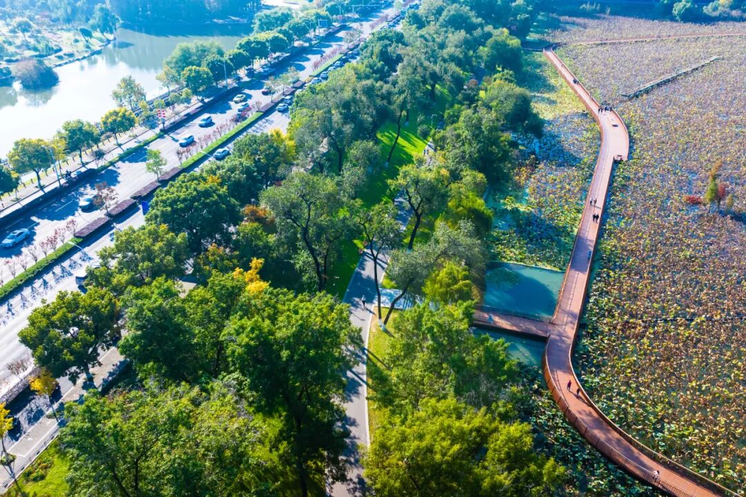和平门湿地,位于玄武湖西北隅,南京城北金川河和北护城河出水口之间,靠近宋代为泄湖为田而开凿的十字河。太平门至神策门段明城墙依湖为建,在此由西而北改变方向,形成湖湾,容易淤积。在明代湖中近岸处有飞云汀、聚凫汀,到清代此处与岸相连被称作后湖洲,成为湖田,直到上世纪六七十年代仍有人耕种,目前是以几个小岛组成的城市小微湿地,一年四季鸥鹭燕雀成群,是鸳鸯、鸬鹚等候鸟的过冬地。和平门湿地采用曲直变换、软硬结合的驳岸。在施工中增加了草坡和植物直接入水的自然驳岸,采用景观石与水生植物组合配置的手法,与叠石驳岸互相穿插,丰富了整个区域的景观效果。湿地采用“水杉+荷花”的组合,在岛岸之间种植水生植物,包括挺水植物、沉水植物及浮叶植物等,营造由岸边水杉林向水下森林生态系统自然过渡的特有景观。