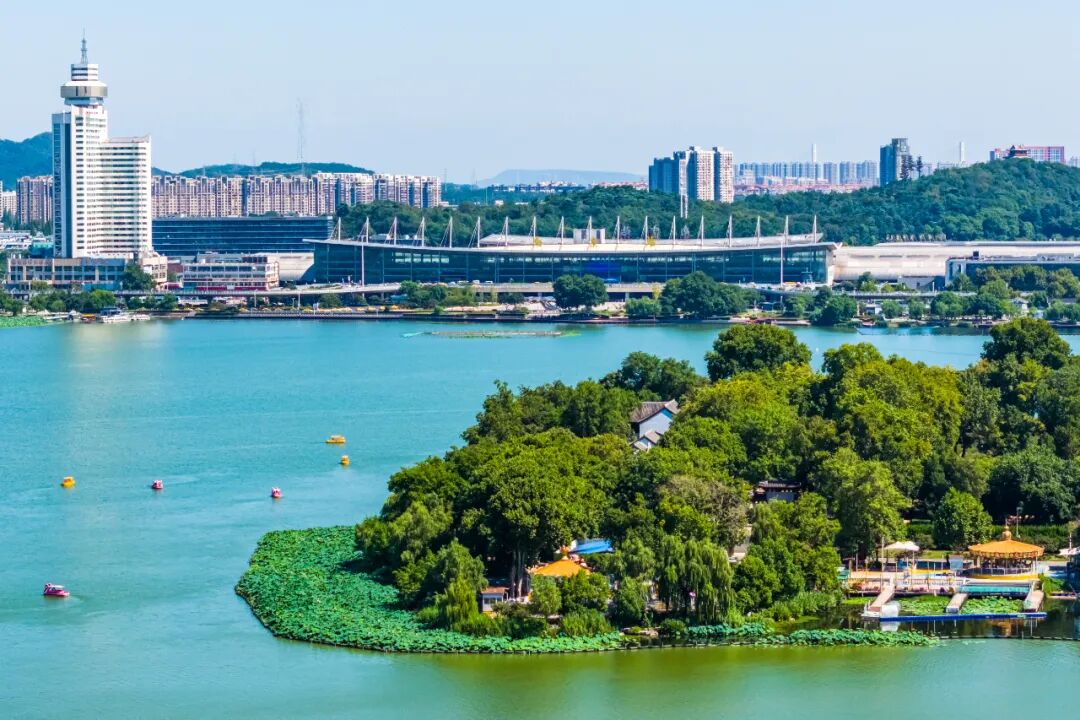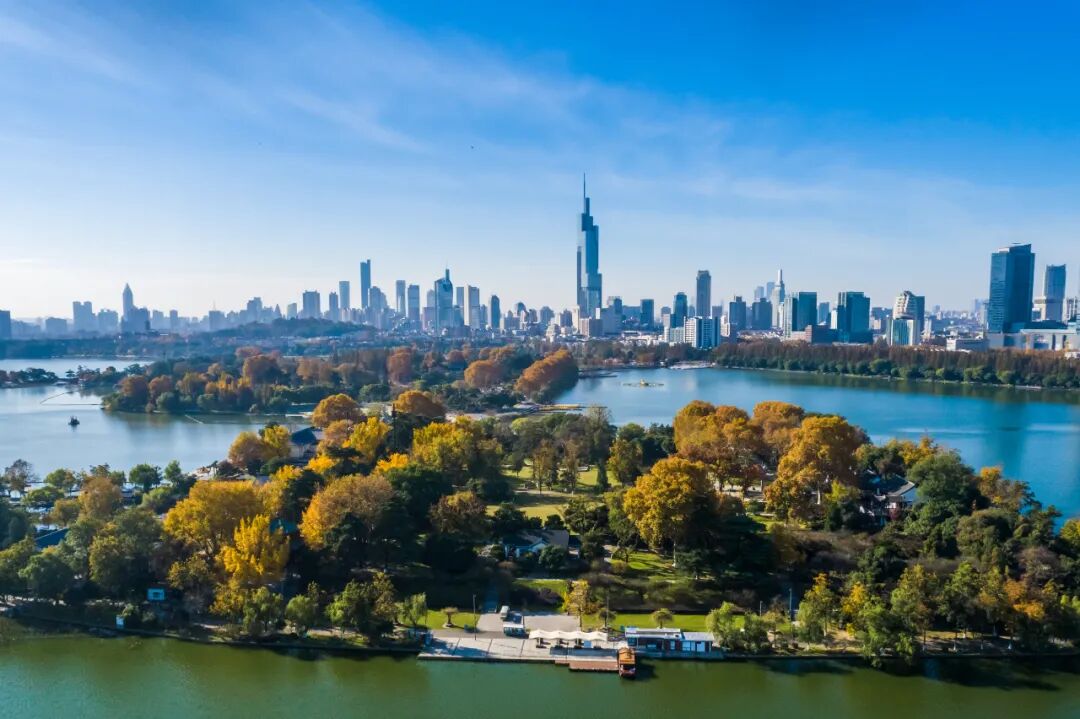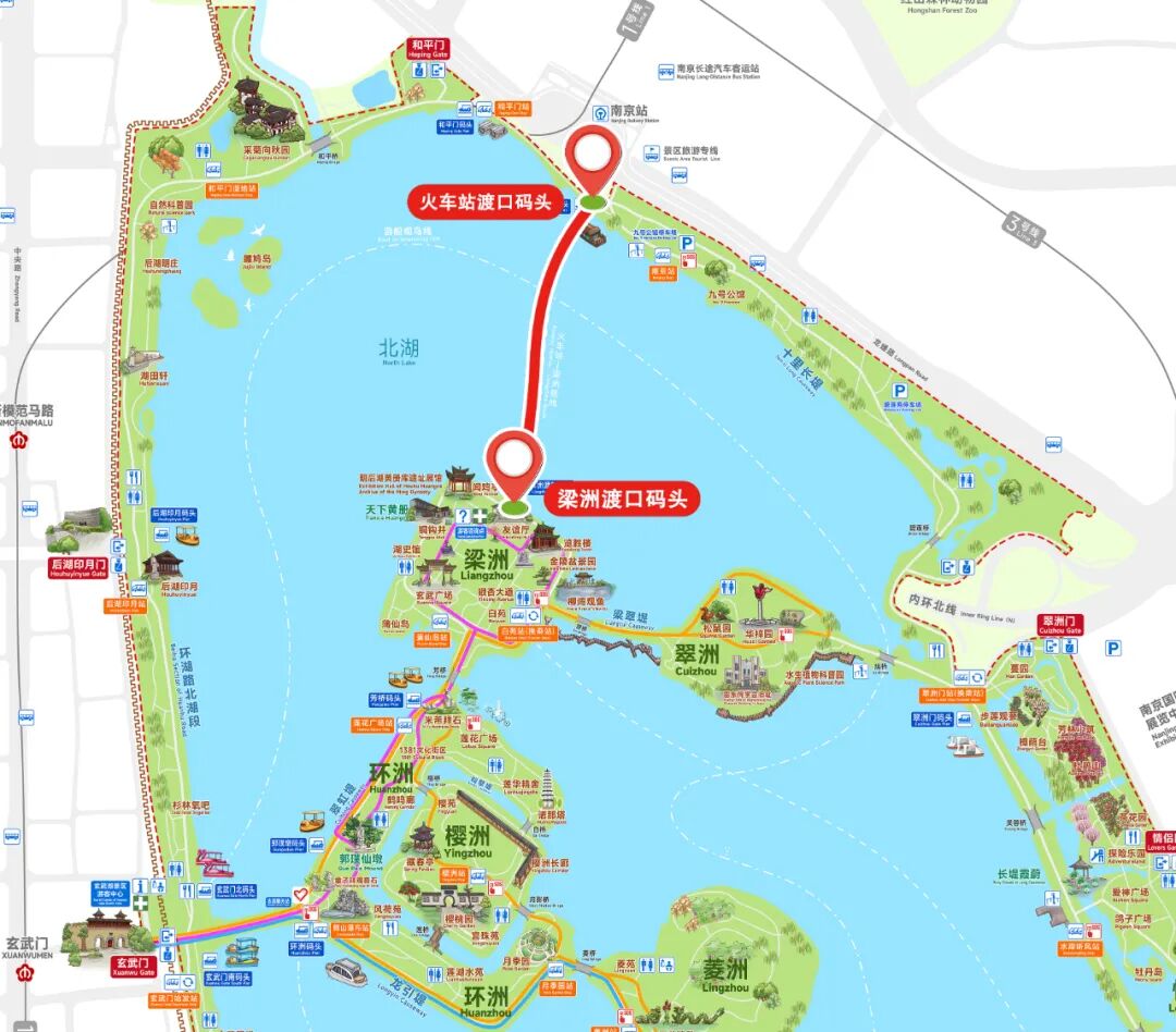 梁洲与南京车站隔湖相望,走出被誉为中国最美火车站的南京站南广场,映入眼帘的便是风光秀丽的一湖碧色,和美丽的城市天际线。乘坐火车站旁的游船码头轮渡,是直达玄武湖梁洲最便捷的水路交通。