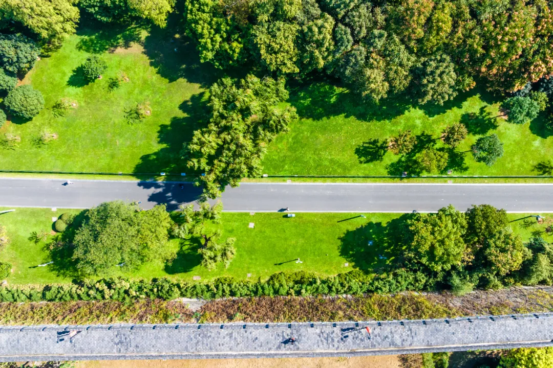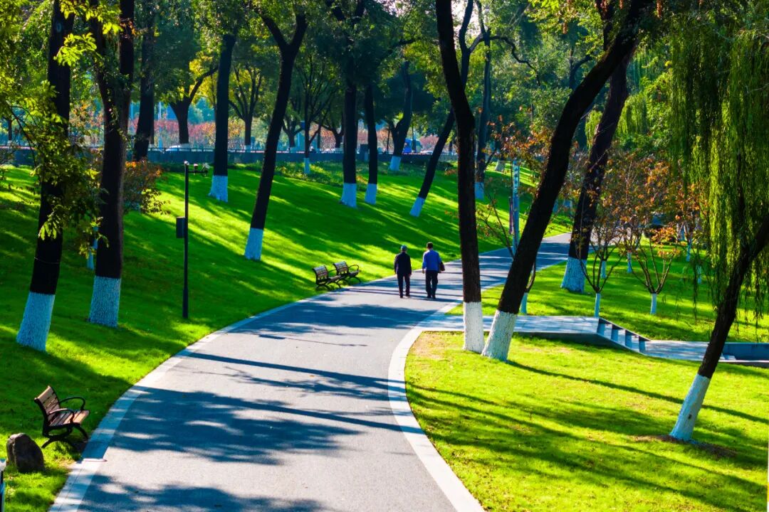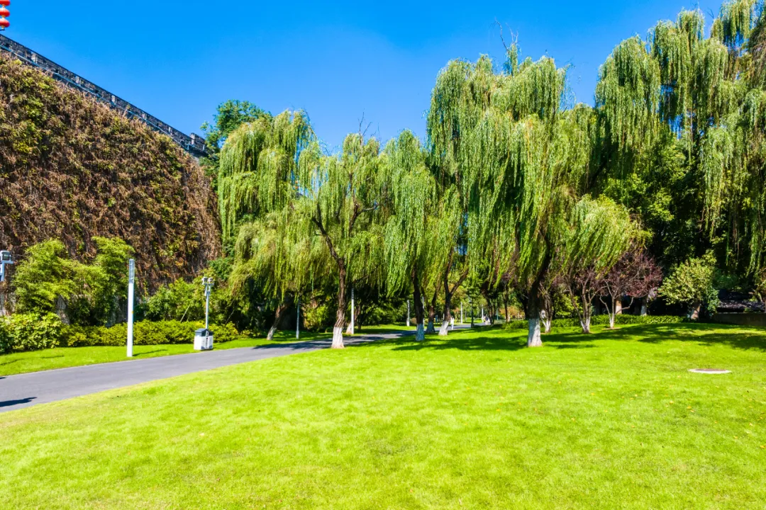 环湖路新模范马路段一侧紧邻明城墙,另一侧是碧绿的草地。草地青葱繁茂,在阳光的映照下,绿意盎然,生机勃勃。微风轻拂时,带来清新宜人的气息,为人们营造出一片宁静且惬意的自然氛围。
