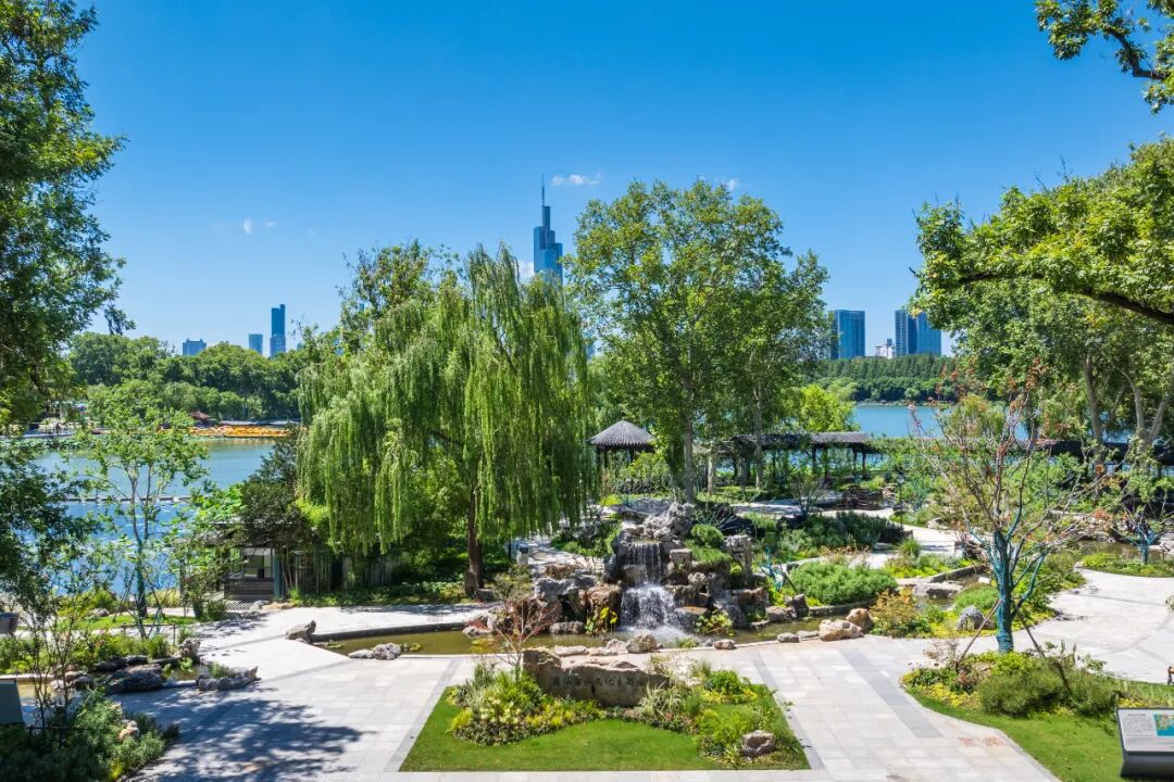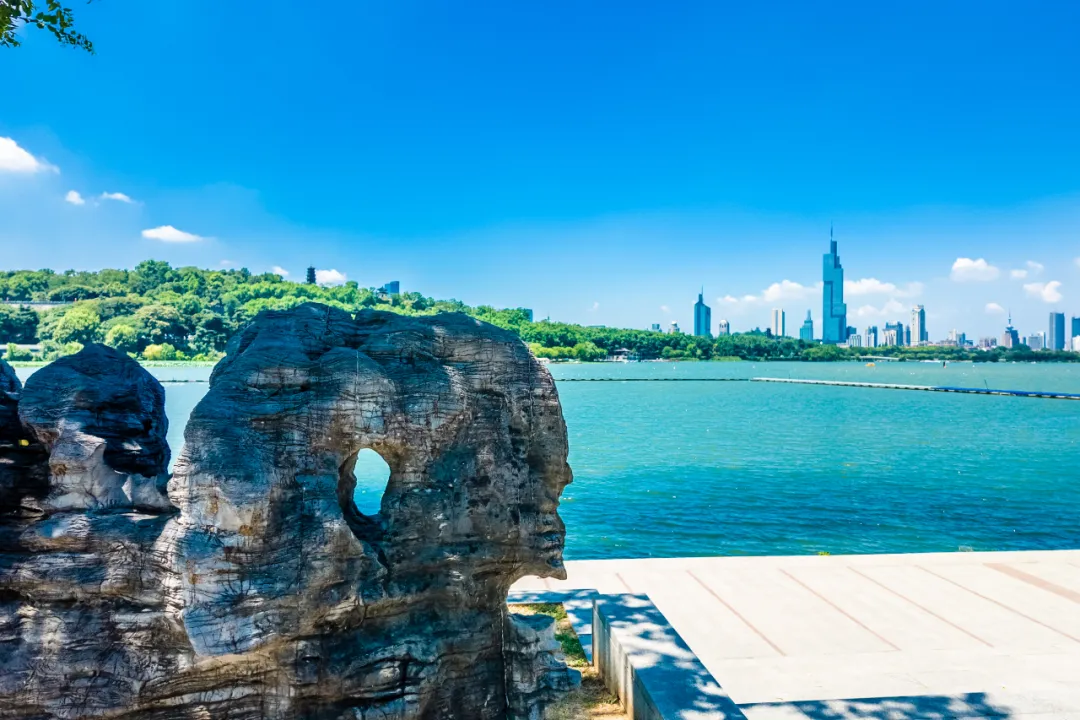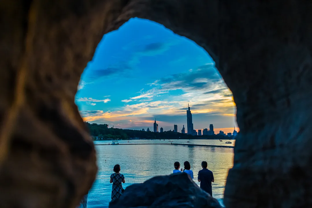 “别有洞天”位于景区十里长堤门往太平门赏荷栈道方向,是玄武湖的新晋日落打卡点。透过景观石缝隙可远眺城市天际线与落日余晖交相辉映,将城市的轮廓线与绚烂的日落完美融合,呈现出一种别样的韵味。