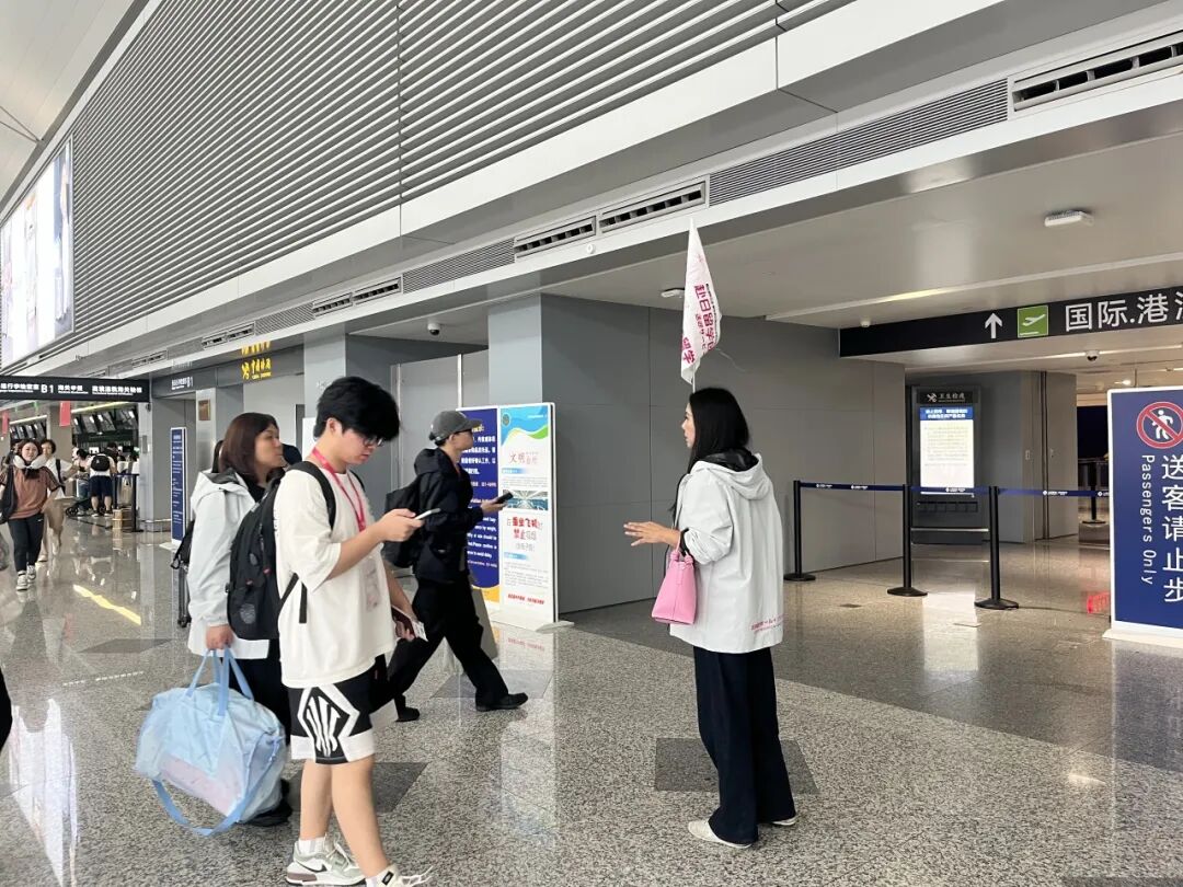 学生们签到后收到专属名牌,确保接机老师指认