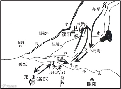 第二步,从图片中可看出的关键词有“齐军”“魏军”“马陵”,作战图中交战双方箭头最终指向“马陵”,可推出本次战役为战国时期的马陵之战。马陵之战是中国战争史上设伏歼敌的著名战例,近代考古显示战场位于今山东省郯城县马陵山附近。这次战役中孙膑利用庞涓的弱点,制造假象,诱其就范,使齐国在战局中始终居于主动地位。