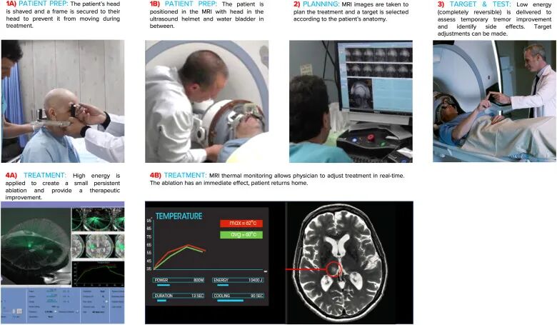 目前,临床实践中唯一被批准用于脑热消融的设备是 ExAblate Neuro System(以色列 InSightec 公司)。该装置由一个直径为 30 厘米的半球形传感器组成,其中包含 1024 个在高频(650 - 720kHz)下工作的相控阵元件,并与 1.5 或 3T MRI 设备耦合。为进行 MRgFUS 手术,患者头部通过立体定向框架连接到 ExAblate Neuro System 换能器,并放置在适配的磁共振成像(MR)床上。框架和传感器之间的空间充满冷的脱气 / 去离子水,由放置在头部周围的橡胶膜保持。这提供了声学耦合,并保护头皮和头骨免受过热(图 1A 和 B)。随后,操作人员在实时 MR 图像上选择目标(图 2)。然后输送低能量(最高 50 摄氏度)以评估患者的获益和副作用,此时这些都是完全可逆的(图 3)。如有需要,此时可调整目标。但是,如果运动特征改善且没有副作用,则进一步升高温度,使病灶变为永久性(图 4A 和 B)。