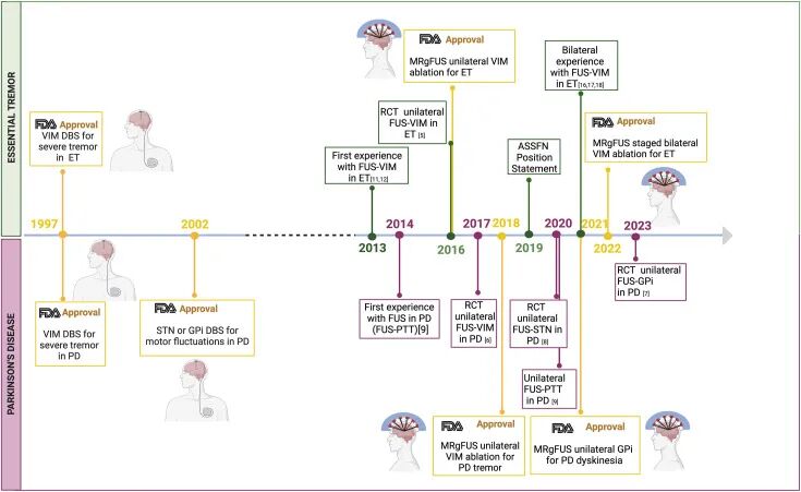 图 1.MRgHiFU 领域治疗运动障碍的主要里程碑时间表。展示了 MRgHiFU 领域治疗特发性震颤和帕金森病的重要里程碑时间,同时也列出了 FDA 批准 DBS 用于特发性震颤和帕金森病的日期,以供时间参考。