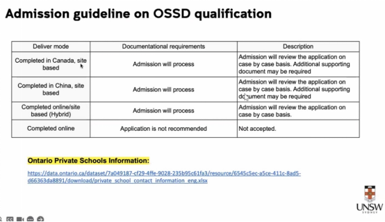 新南威尔士大学:线上OSSD课程是不接受的,其他的线下课程,包括加拿大境内(外)的学校开设的OSSD课程,可以参考以下的表格: