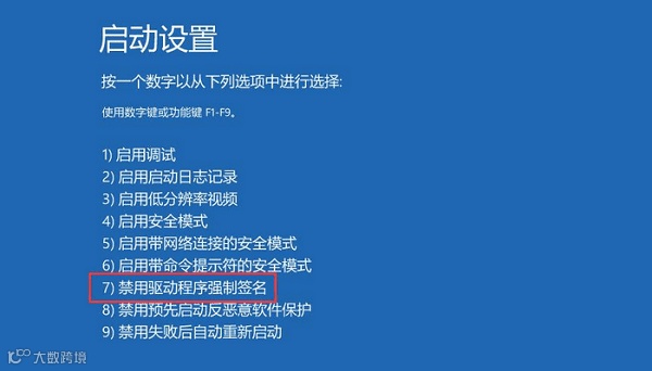 2、重启后按数字键 7 选择“禁用驱动程序签名强制执行”。