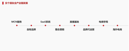 公司围绕直播电商产业链上下游,发展出了MCN服务、自有品牌孵化、供应链SaaS系统、主播培训学校、直播基地、品牌代运营、整合营销和海外电商等八大业务,可以为品牌提供新媒体和电商领域全生命周期的产品和服务。