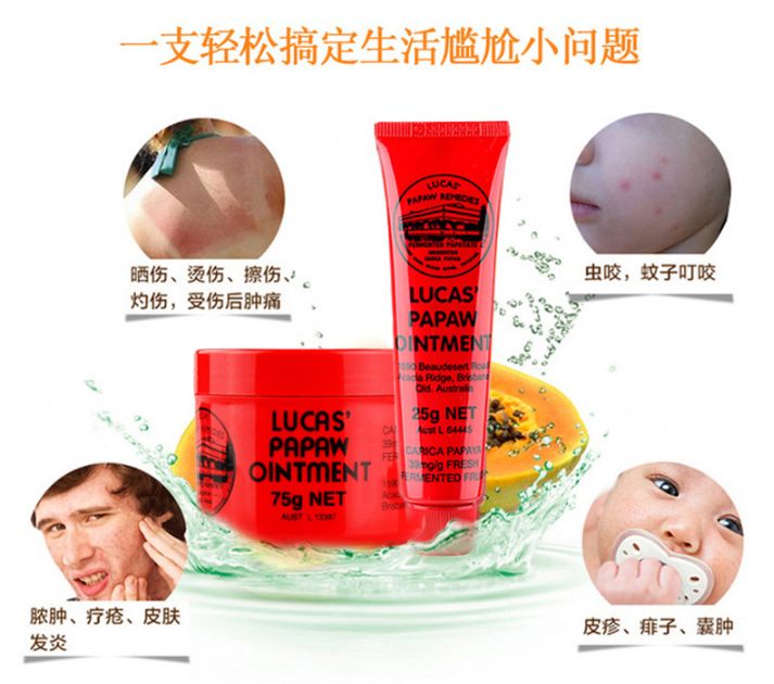 Lucas' Papaw Ointment是采用纯天然番木瓜制造而成的药膏,它只有淡淡的清香,不刺鼻也不刺激皮肤,每克番木瓜膏含38毫克新鲜水果发酵成分,可用于局部外熬,对于疮、烧伤、擦伤、割伤、皮肤皱裂、皮疹、碎片、开放性伤口、昆虫叮咬和尿布疹效果明显,同时还可以当护唇膏、护手足膏,防止皮肤干裂。它含有木瓜蛋白酶可完全清洁感染部位脏物及清洁伤口,时尚杂志,推荐的最受欢迎的护唇产品就是它!而且里面还写到,如果晚上用它来当护手霜,第二天会发现双手滋润极了,还可以去除宝宝的湿疹,因为纯天然所以不用担心对身体有伤害。