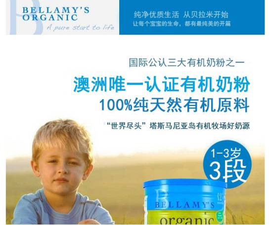 贝拉米有机奶粉是全球三大有机奶粉品牌之一,同时也是澳洲第一有机婴儿食品品牌,以最安全、最干净的奶粉著称。贝拉米有机农场位于澳大利亚的一个美丽的小岛——塔斯曼尼岛上,占地30000亩。整个农场由澳大利亚有机认证机构NASAA监控,所有奶牛均不可人工喂养饲料,整个农场的牧草均不可用杀虫剂,也不可以用化肥,奶牛也不可以使用任何药物包括抗生素,而制造奶粉的机械有特殊要求,由于NASAA有机认证的要求如此之高,目前包括澳大利亚及新西兰只有贝拉米奶粉拿到有机奶粉证书。为全世界宝宝的人生创造有一个纯净的开端,是贝拉米的使命。贝拉米非常热衷于向孩子们推行专注饮食的理念。