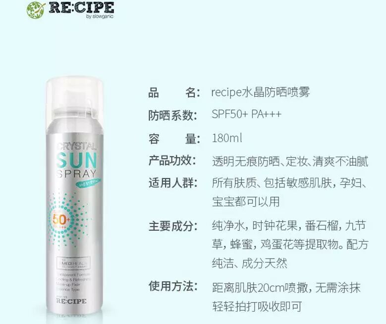 RE:CIPE冰感水晶防晒喷雾180ml,不以防晒为基础的护肤都是耍流氓!