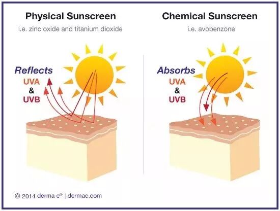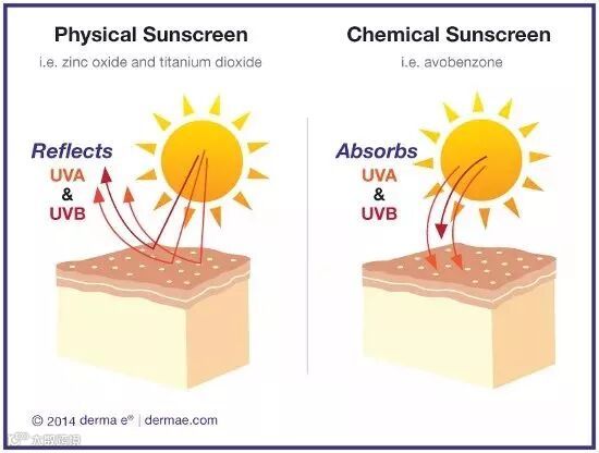 物理防晒是通过反射紫外线来达到防晒效果,化学防晒则是通过吸收紫外线并将它转化为热量再释放,从而达到防晒效果。
