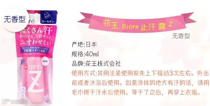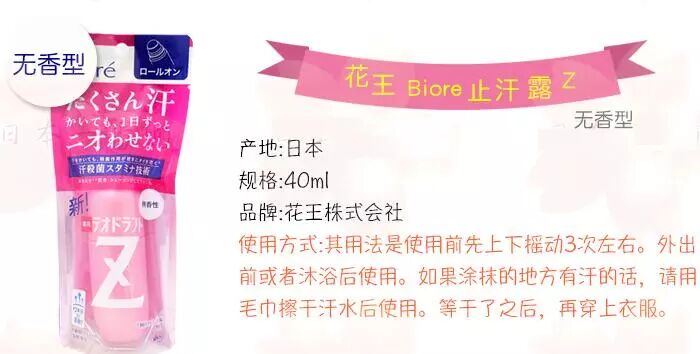 很卡哇伊的粉色包装,一支40ml 滚珠型~, 使用前上下摇晃3次左右.只要外出前涂抹一下~能避免腋下出汗湿透衣服的尴尬哦~ 采用止汗杀jun新技术,长时间抑制汗臭味 是爱出汗妹子的福音~