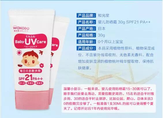 这款防晒霜独特的配合了与母乳成分接近的保湿因子,富含卵磷脂,低聚糖等,防晒的同时保湿。不含紫外线吸收剂,容易涂抹,不发白,不黏不腻,用香皂就可以彻底清洗干净专为宝宝设计配方,低刺激,无香料,无着色,不含酒精,从新生儿开始就能使用。 夏季为宝宝防晒,须使用专为婴童设计的防晒品